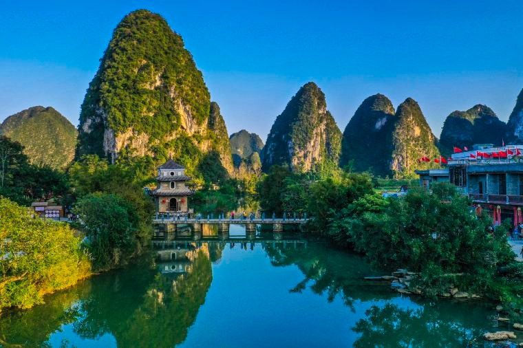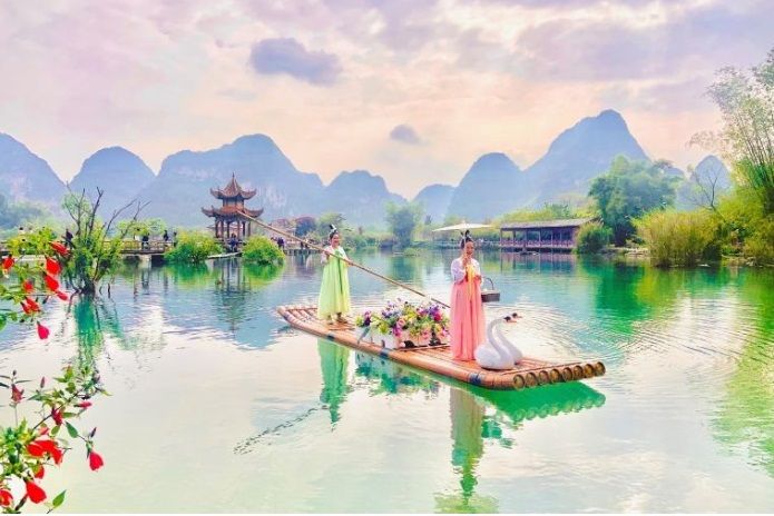 Vào Trung Quốc, hướng dẫn viên địa phương đón đoàn, tham quan khu du lịch Nga Tuyền nổi tiếng với kiến trúc cổ trang đậm chất Trung Hoa. Quý khách có thể trải nghiệm đi bè tre ngắm cảnh (chi phí tự túc).